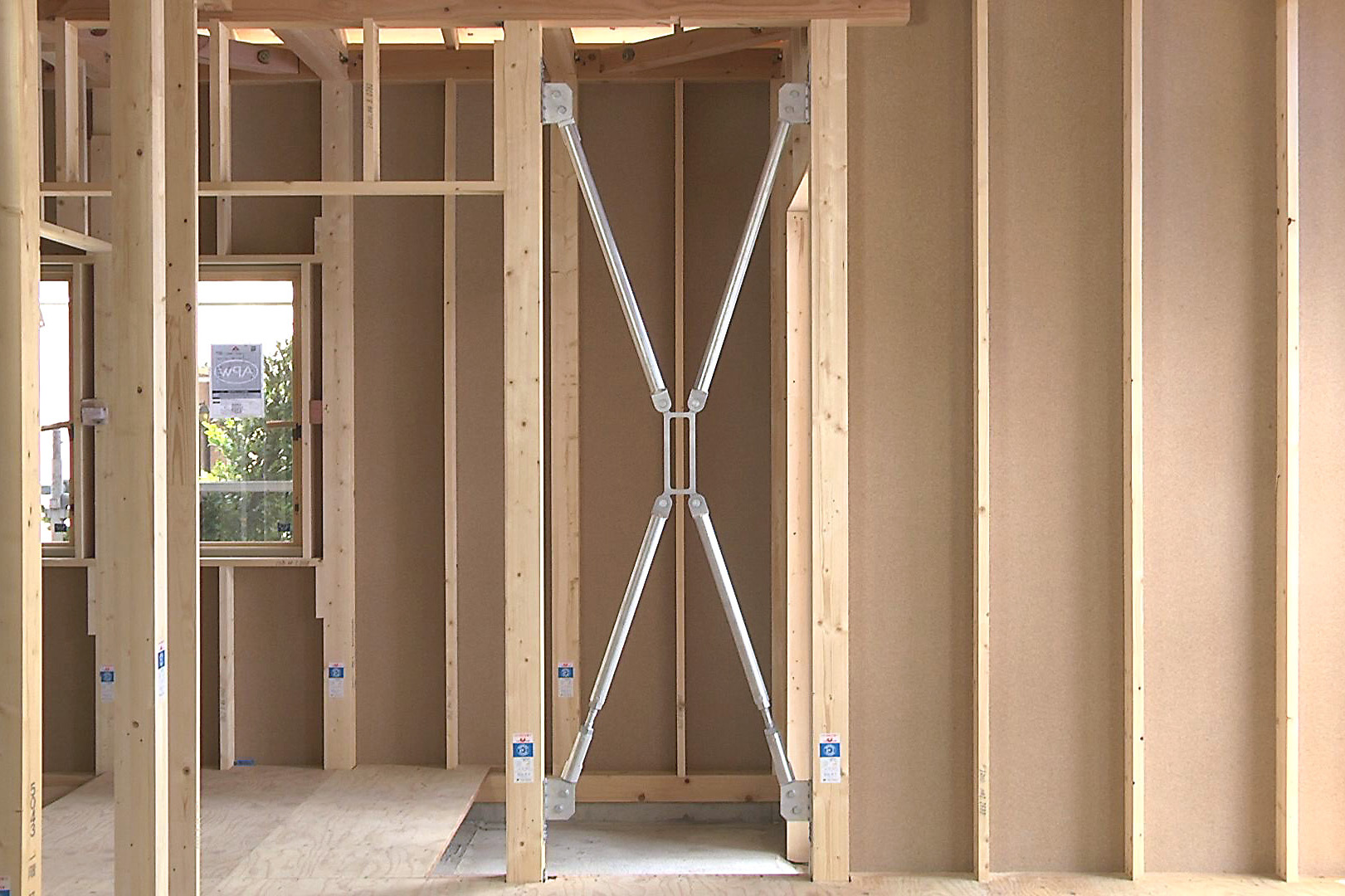 制振ダンパーを取り付ける事で、木材の場合、揺れた時に伸縮できないので部分的なストレスは大きくなりますが、制振ダンパーを使用することで伸縮する力でストレスを軽減します。車のサスペンションを想像して頂ければわかり易いと思います。