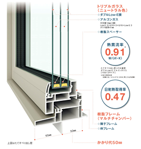 1つはW断熱工法や2×6工法といった高断熱仕様の採用。2つ目は「トリプルガラス」を基準とした高断熱仕様の窓です。