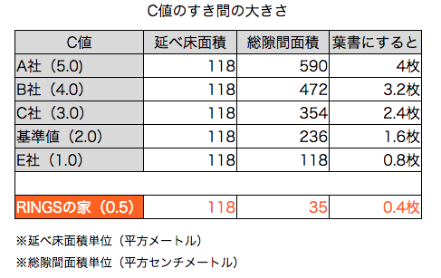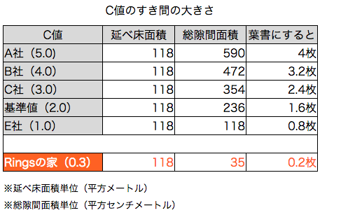 上記の表の値が小さければ小さいほど隙間が少ないということになります。 RINGSの住宅では建物の形状にもよりますが、 C値が「 0.3~ 0.9」 (平均実績 0.6)という数値をお約束いたします。35坪の家の場合、ハガキの大きさの半分程度の隙間しかないということになります。