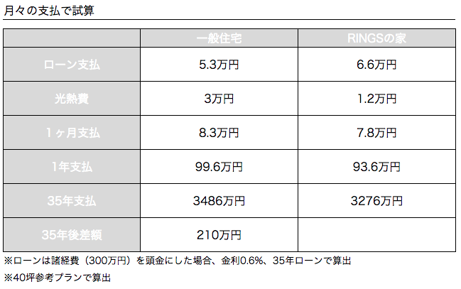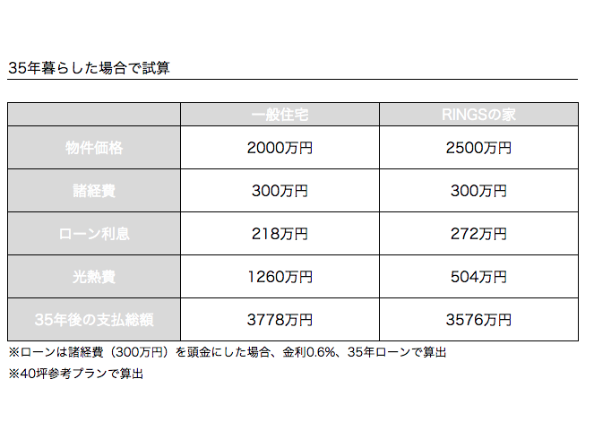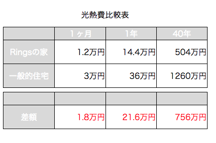 家を新築する時に重視する事の一つに予算があります。下の表を参考にしていただくとわかりやすいと思いますが、 RINGSクオリティーの住宅は実際にお住まいになった時の光熱費が一般と比較して 60%ほどの省エネ性能があることがお分かり頂けると思います。